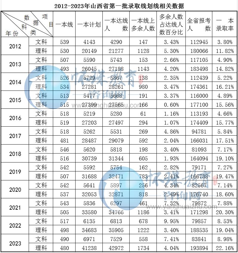 下表为2012-2023年山西省文理科第一批划线相关数据,我们以此为例来说明高考划线过程。