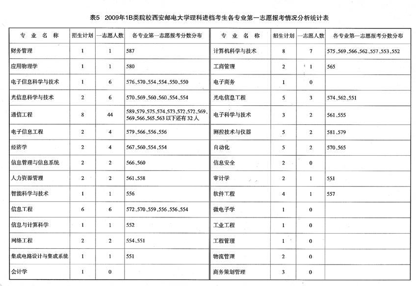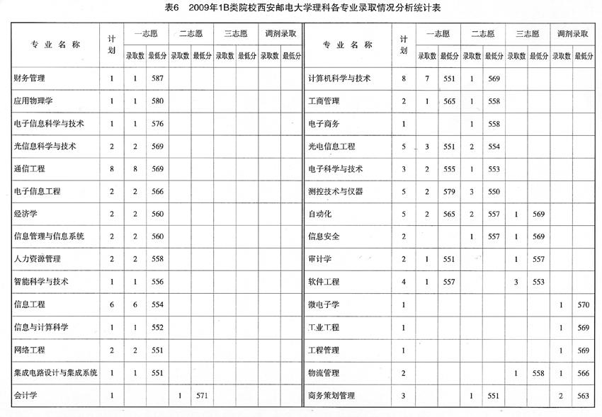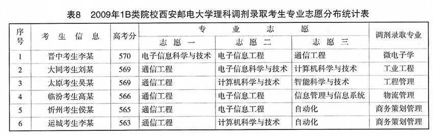 在长期的招生实践中我们发现,多数考生或家长对选报院校志愿比较重视,分析、研究得也比较透彻,但在院校对已投档考生如何分配专业(院校二次投档)方面还认识不够,没有引起足够的重视,规律研究得也不透彻,甚至费了九牛二虎之力,高考成绩也达到了院校的投档线,只是由于专业志愿选择不当而被院校高分退档,与理想中的高校擦肩而过,留下了终身的遗憾。尤其对于第一批重点高校的高分考生,损失更大!在实践中我们还发现,有少数考生虽然没有认真研究规律而被理想的高校和专业录取,但这都是“瞎猫撞上死耗子”,歪打正着。这也是以大多数考生或家长不认真研究规律造成的高分退档为前提的,如果大家都来认真研究规律,这部分歪打正着的考生也就没有市场了。因此,为了考生十二年寒窗苦读有一个满意的结局,为了自己子女的人生有一个理想的起点,考生或家长一定要认真分析、研究这些规律。下面以2009年理科1B类院校西安邮电大学对已投档考生的专业分配为例来解剖、分析选择专业志愿的规律和技巧。