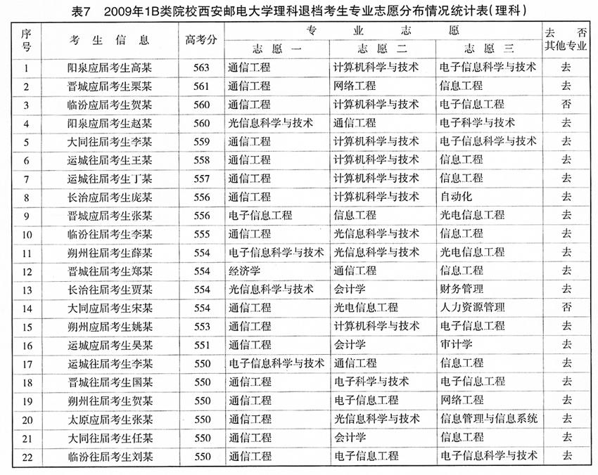 (1) 2009年西安邮电大学在山西的理科招生计划是78人,按照1∶1.2比例投档,省级招办应向该校投档94人,而551分以上院校第一志愿报考该校的考生只有93人,全部投放该校仍缺1人,电脑继续从551分降低1分,即由550分检索第一志愿报考该校的考生,结果显示550分第一志愿报考该校的考生共有7人,虽然按投档比例只缺1人,但这7人中只向院校投放哪一位考生则对其余6位考生都是不公平的,为了公平投档,电脑会依据投档程序同时把这同分的7人全部投向该院校,由学校审录。由此可见,由于有相同考分的考生存在,省级招办在向院校投放考生档案时,一般都会超过院校所要求的投档比例,这样就加大了由于专业志愿选报不当已投档高分考生被退档的概率。