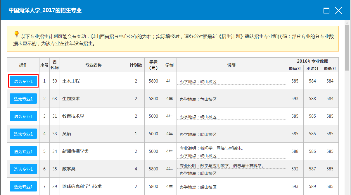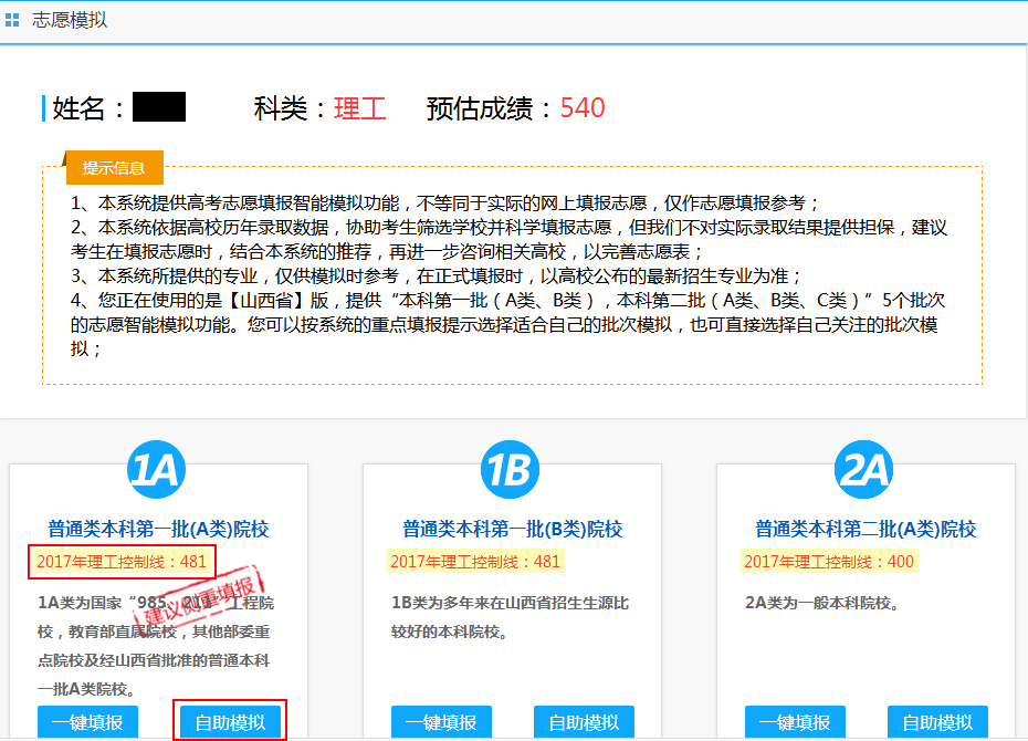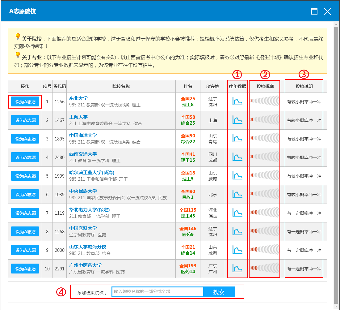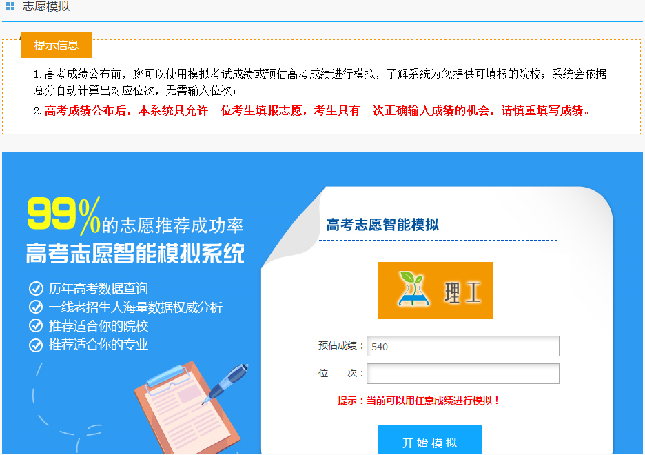 3.志愿模拟系统提供的信息仅供用户填报志愿时参考,用户应考虑到高校招生计划、录取政策、考生心理和其它偶然因素引起的偏差。用户不能以本系统提供的信息作为填报志愿的绝对依据。