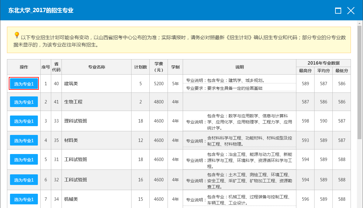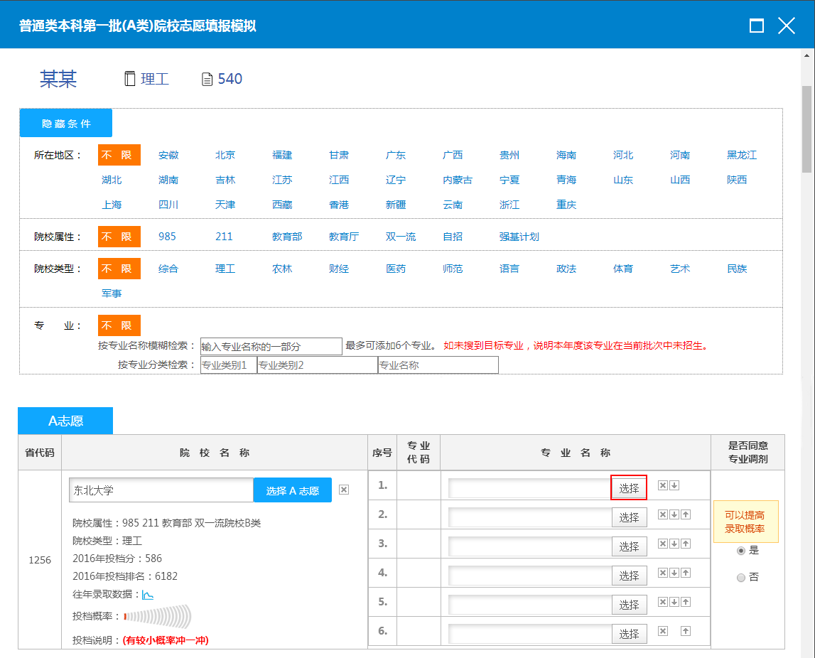 6.在系统为您推荐的院校中进行选择。例如,选择东北大学设为A志愿,点击按钮后,回到模拟界面,点击选择按钮,弹出专业选择页面,挑选一个专业(如:建筑类),点击选择专业1按钮,把它设为专业1,之后会回到选择专业的界面,按上述方法继续选择剩余的5个专业。