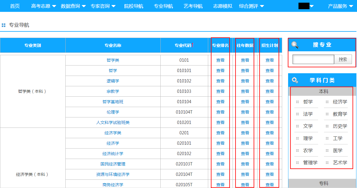 (1)在专业导航中可以根据学科门类查找专业,或直接搜索专业名称,同时也可以查询相应专业在各个院校的招生计划和往年分专业录取数据以及专业排名。