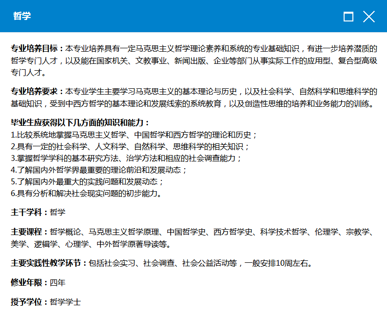 (2)点击专业名称(如:哲学)会有相应的专业介绍。