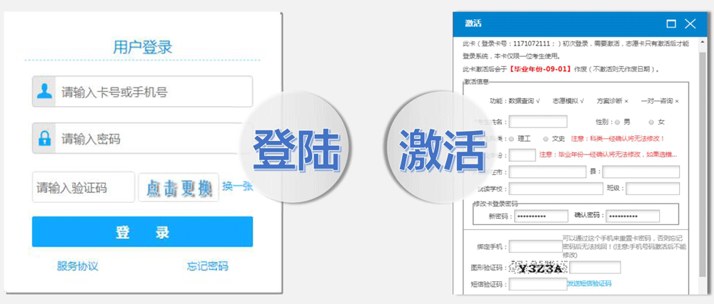 2.持卡用户首次登录时,在网站首页右侧“用户登录”窗口中输入您的卡号和密码及图形验证码。点击登录按钮,会提示您志愿卡激活才能使用,请先激活。输入要填的信息,*号为必填选项,然后点击确定激活,提示激活成功后,又回到登陆界面,重新输入密码、验证码即可使用文理志愿卡。