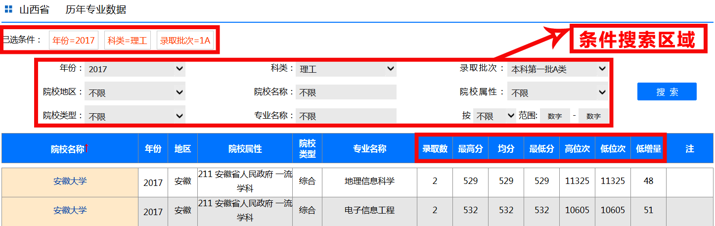 该功能可以查询历年专业数据、招生计划、历年成绩统计以及历年控制线等数据。