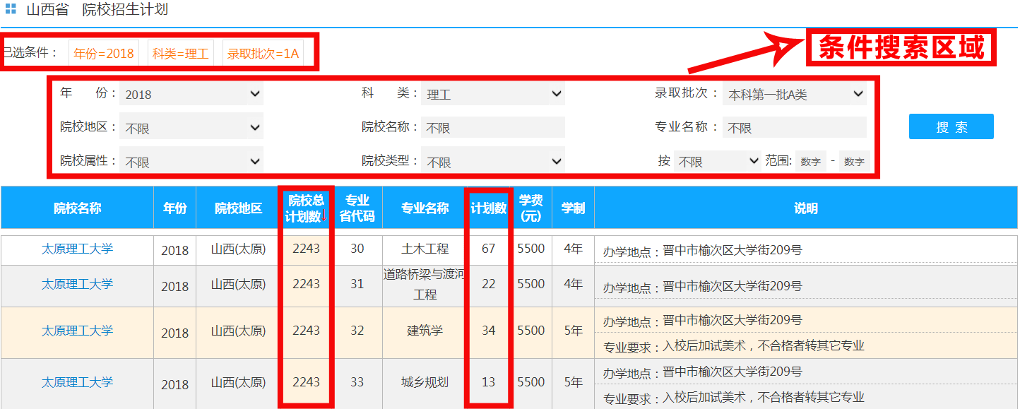 (2).招生计划查询。在该页面中可以查询本年度各院校分专业招生计划,该功能可以为您节省翻阅《山西省填报志愿指南》一书的大量时间。