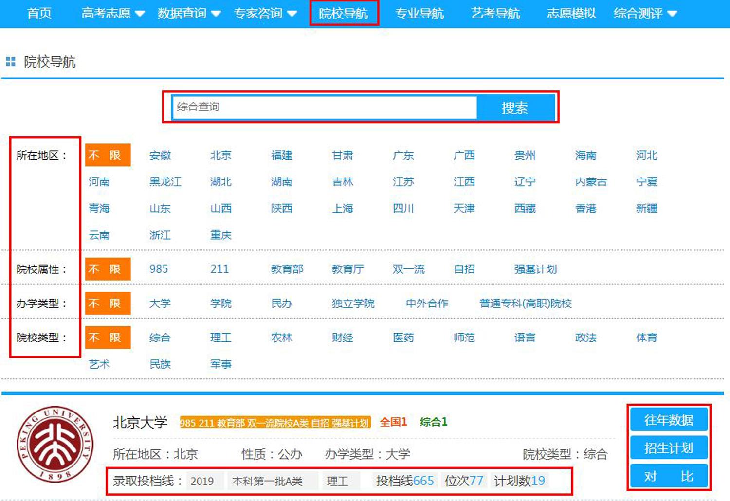 (1)在院校导航中可以按所在地区、院校属性、办学类型、院校类型查找院校,也可以直接输入院校名称查找院校。同样也可以查询相应院校的招生计划和近五年院校投档线及最高分、最低分。