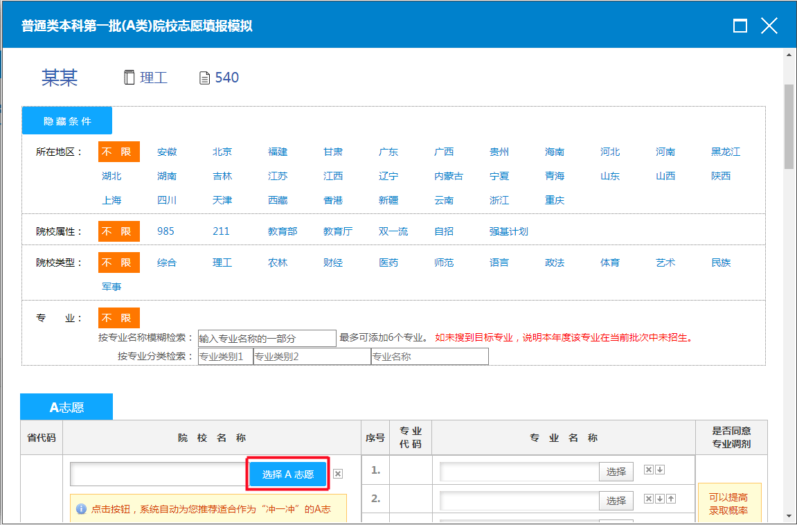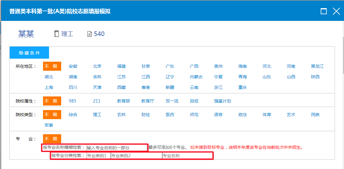 10.还可根据指定条件进行自助模拟,例如:院校所在地区、院校属性、院校类型、专业等条件