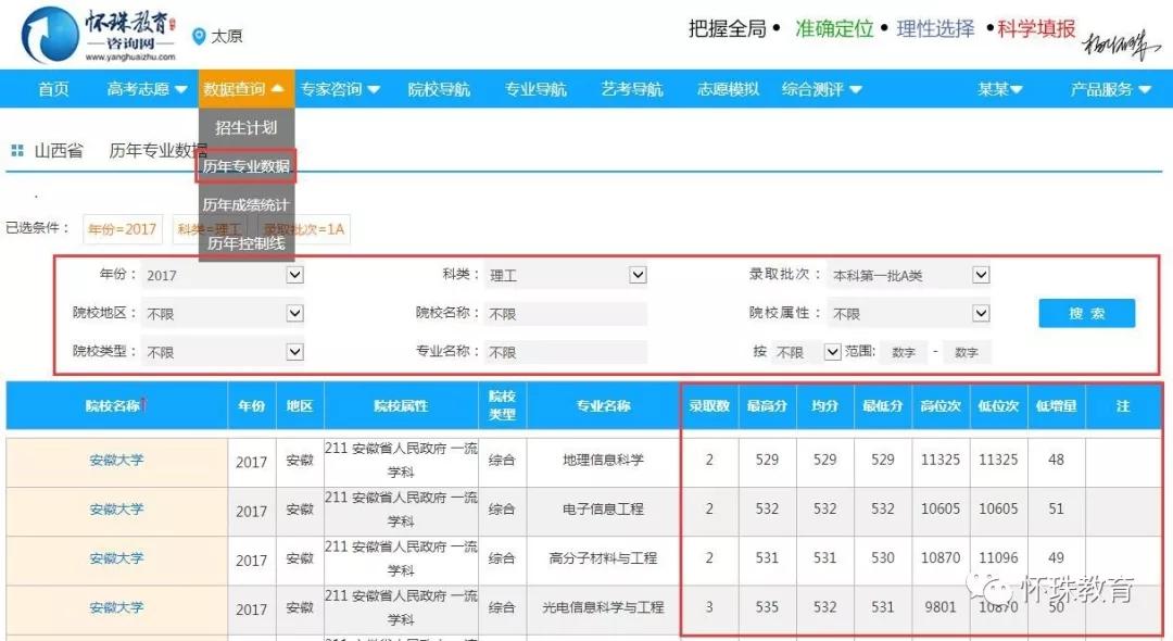 可以查询历年来在晋招生院校专业的录取数据(包含最高分、最低分、平均分等数据),为报考志愿提供数据支撑,并且可以根据不同条件进行筛选、排序。