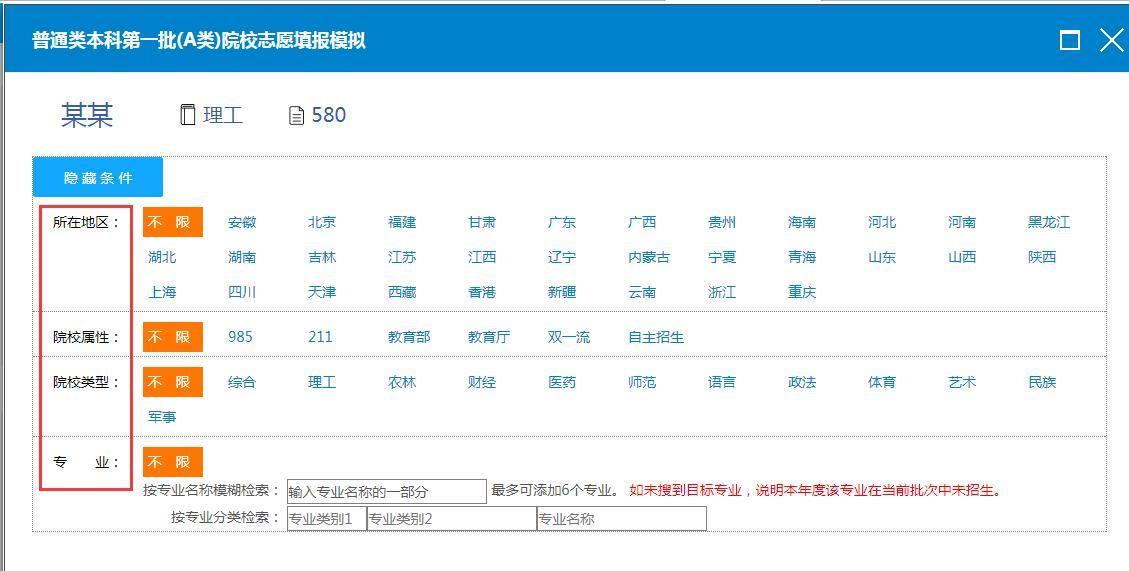 (3)也可以按照院校地区、院校类型、院校属性、专业等条件筛选适合您填报的院校