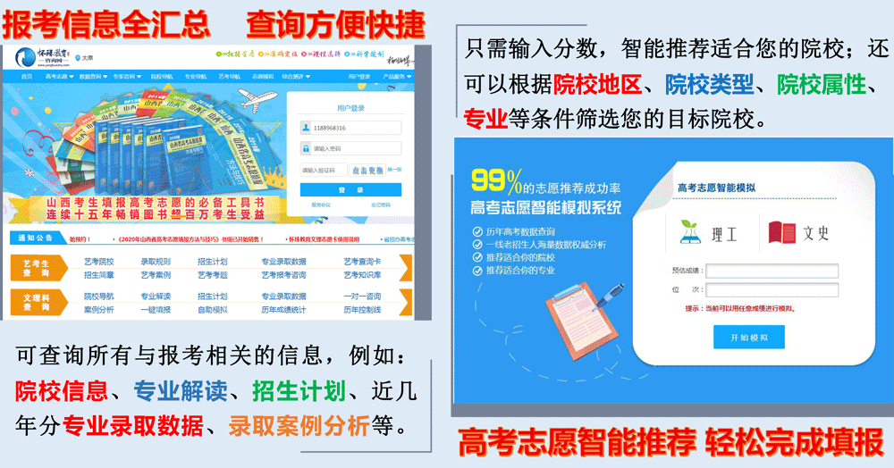 文理志愿卡的核心功能是依据往年招生录取数据,并结合山西省招办杨怀珠老师30多年的招生录取工作经验,再利用计算机辅助考生科学合理快捷的报考志愿。