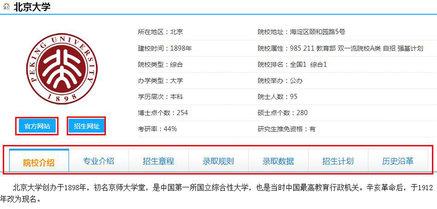 可查询所有与院校相关的信息,例如:院校背景介绍、优势专业介绍、招生章程、录取规则、历史沿革、招生计划、录取数据等