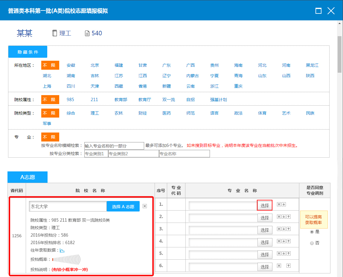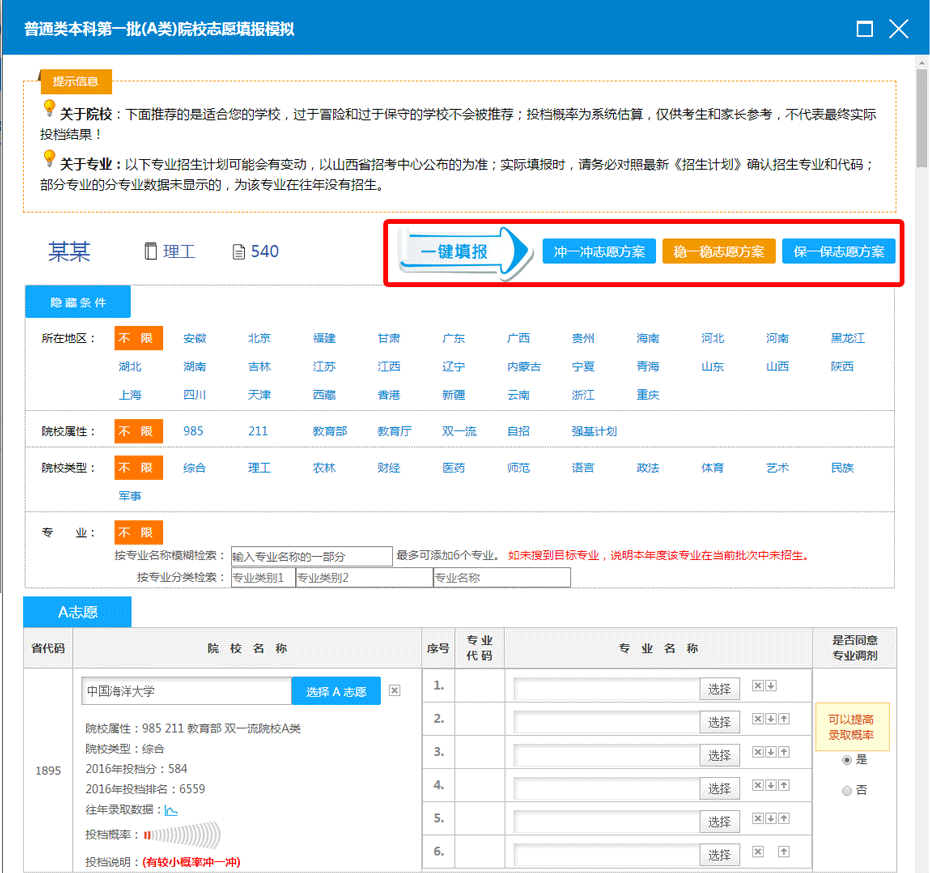 输入考试成绩开始自助模拟,系统会自动为您提供适合您填报的所有院校,由您自助选择,选择后系统会对院校的录取概率做出提示。