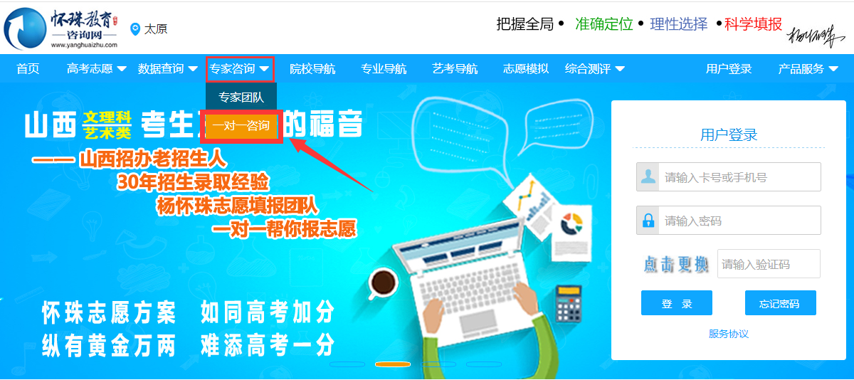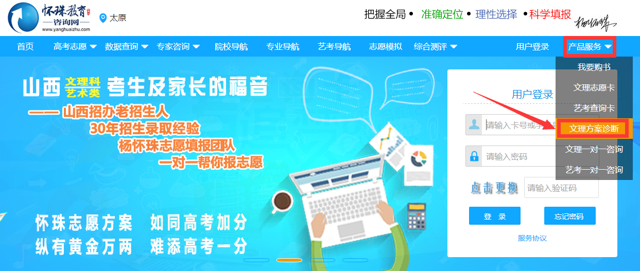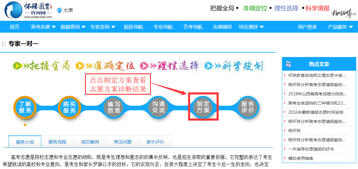 第一步:在怀珠教育咨询网(www.yanghuaizhu.com)首页如下图,点击文理方案诊断进入购买页面,根据提示选择相应的付款方式完成付款,付款成功后即视为预约志愿方案诊断服务成功;