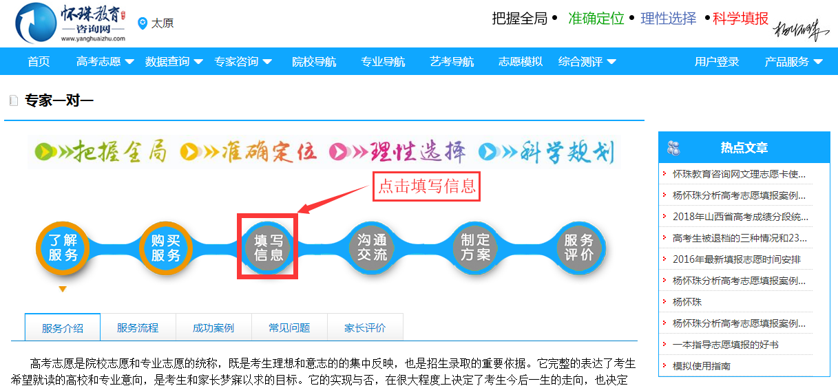第三步:登陆后,在怀珠教育咨询网首页如下图,点击一对一服务后,再点击咨询流程图(如下图)中的填写信息,就可以看到志愿方案诊断信息表需要考生或家长填写;