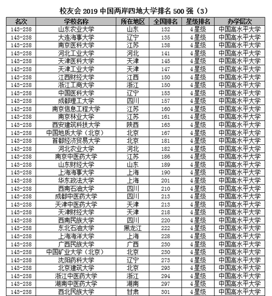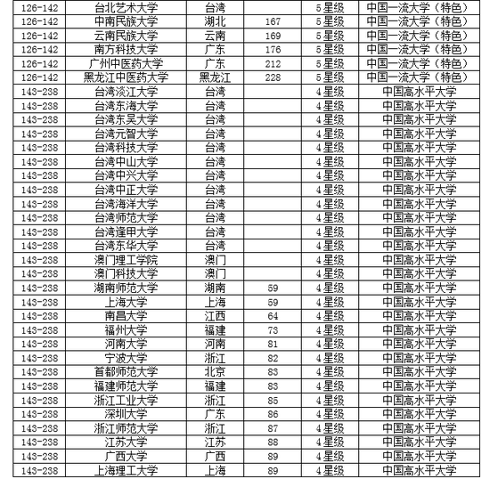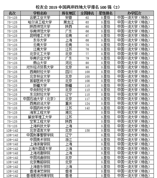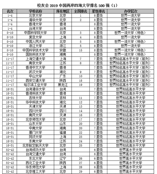 报告显示,在最新校友会2019中国两岸四地大学排名500强中,全国共有10所高校荣膺2019中国八星级大学(8★),核心办学指标和综合实力达到世界一流水平,率先晋升世界一流大学行列。其中,北京大学、清华大学、香港大学、台湾大学并列2019中国两岸四地大学排名第1名,是目前中国海峡两岸暨香港澳门地区综合实力最强、办学水平和办学层次最高的中国最好大学,代表着中国高等教育的最高水平。中国科学院大学、复旦大学、中国人民大学、浙江大学、中国科学技术大学、国防科技大学等跻身前10强。