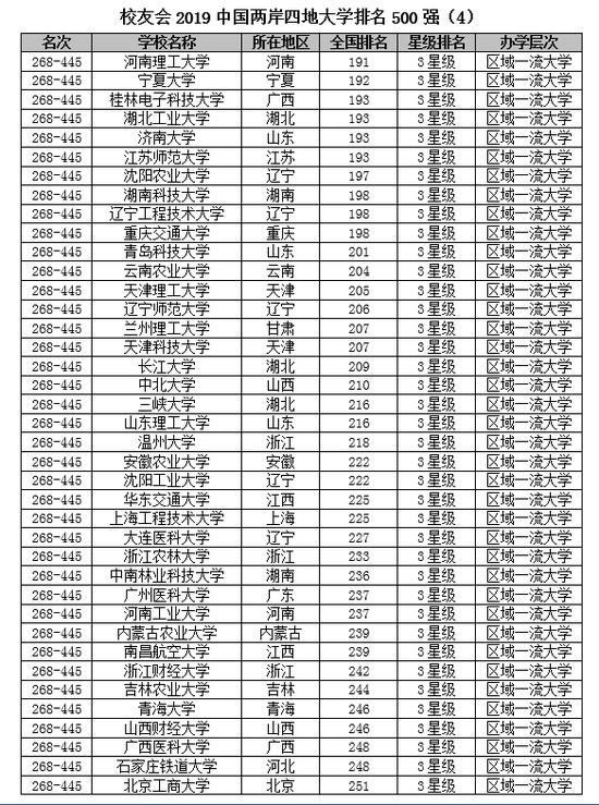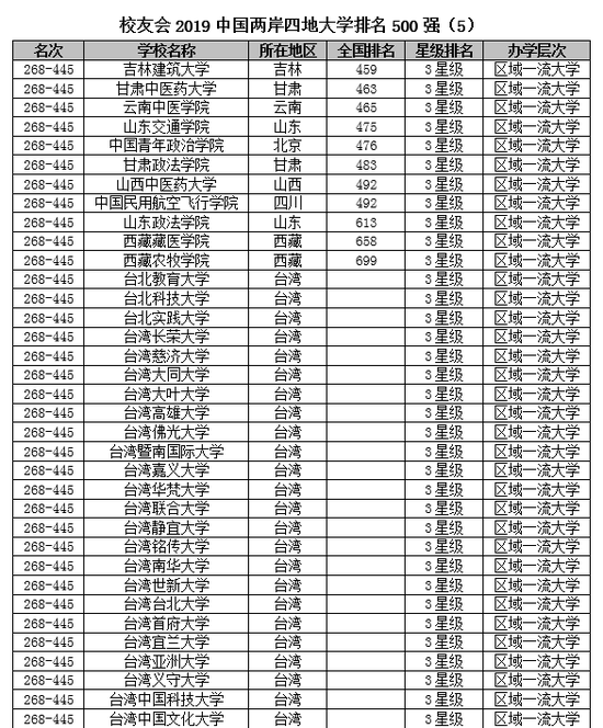 2019年1月21日,由艾瑞深中国校友会网编制完成、科学出版社即将出版发行的《2019中国大学评价研究报告—高考志愿填报指南(校友会版)》最新公布2019中国两岸四地大学排名500强、2019中国大学分档次排名和2019中国各省市区大学排名等榜单。报告显示,北京大学、清华大学、香港大学和台湾大学雄居校友会2019中国两岸四地大学排名前4强,位列第5至第10名的高校为中国科学院大学、复旦大学、中国人民大学、浙江大学、中国科学技术大学和国防科技大学。