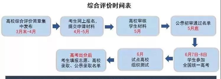 综合评价和自主招生一样,是高校公开发布信息,学生自愿报名参加,全程公开的招生形式。几个重要时间节点如下: