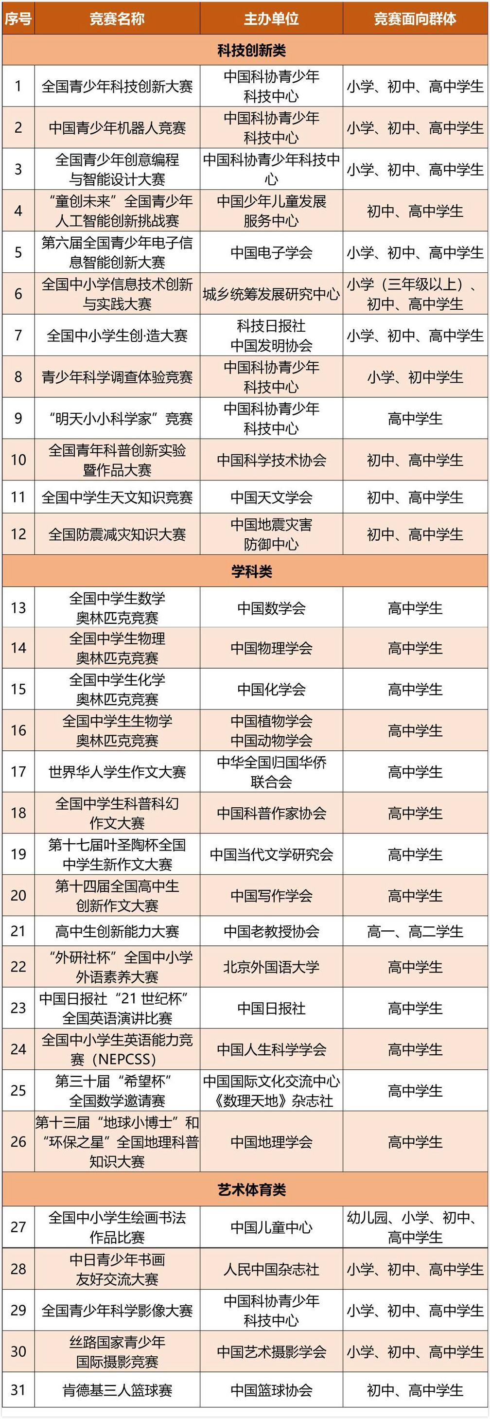 根据《教育部办公厅印发<关于面向中小学生的全国性竞赛活动管理办法(试行)>的通知》(教基厅〔2018〕9号)精神,在经主办单位自主申报,组织进行资格审核和组织专家评审的基础上,经研究拟确定全国青少年科技创新大赛等31项竞赛为2019年度面向中小学生开展的全国性竞赛活动。现就相关信息予以公示,公示期为2019年1月28日至2019年2月3日。