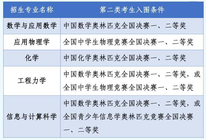 全国青少年学科奥林匹克竞赛(数学、物理、化学、信息学)全国决赛中获得一、二等奖的考生。全国青少年学科奥林匹克竞赛获奖学生以全国青少年科技竞赛获奖名单公示网站(http://gs.cyscc.org/)公示的名单为准。