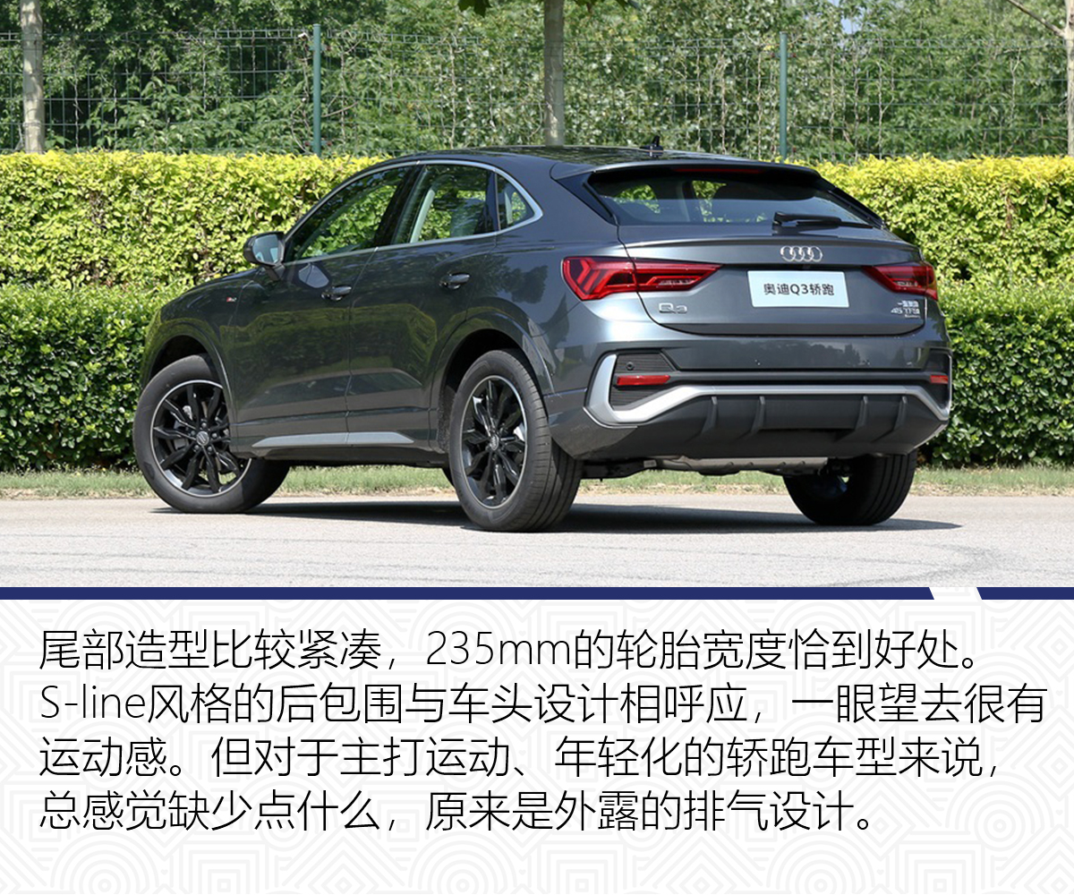 奥迪Q3轿跑的长宽高分别为4518mm、1843mm和1573mm, 相比普通版长度增加23mm,车身高度降低43mm,加之更低的肩线,降低了车身的视觉重心,使得奥迪Q3轿跑具备更加激进的车身姿态。