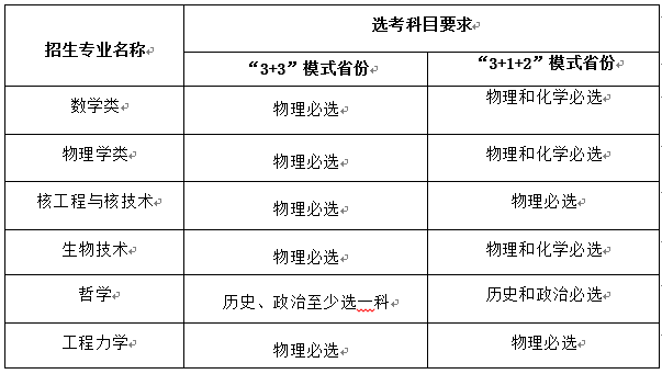 1.招生专业:数学类、物理学类、生物技术、哲学、核工程与核技术、工程力学。在非高考综合改革省份,哲学专业招收文科生,其他专业招收理科生。对实行高考综合改革省份的考生,选考科目须满足以下要求: