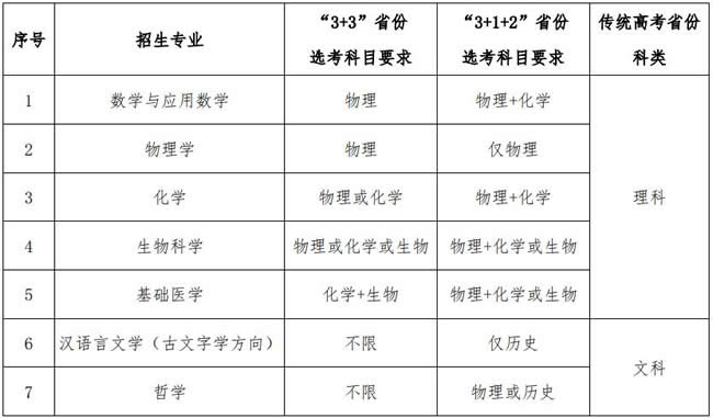 数学与应用数学、物理学、化学、生物科学、基础医学﹑汉语言文学(古文字学方向)﹑哲学。我校将在北京市﹑河北省﹑山西省﹑吉林省﹑江苏省﹑浙江省﹑安徽省﹑福建省﹑江西省﹑山东省﹑河南省﹑湖北省﹑湖南省﹑广东省﹑广西壮族自治区﹑重庆市﹑四川省﹑陕西省投放强基计划招生专业,具体分省分专业招生计划以报名系统内公布为准。
