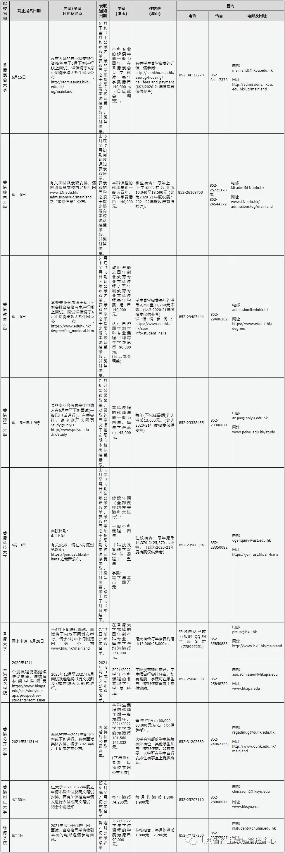 香港院校2021年招收内地本科生一览表
