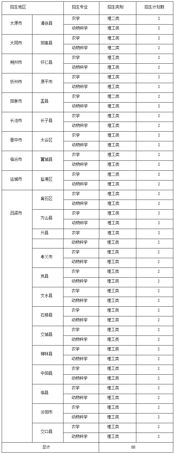 2021年招生计划88人,招生专业为农学和动物科学,每个专业44人。定向招生的区域为全省22个县(市、区),分别是吕梁市的13个县,清徐县、阳高县、怀仁县、原平市、盂县、长子县、晋中市太谷区、翼城县、运城市盐湖区。