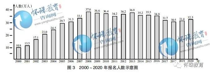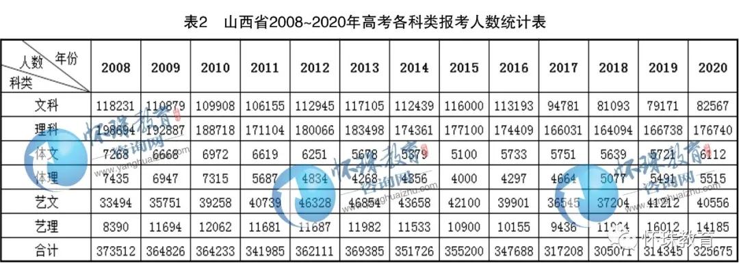 山西省地处内陆省份,人口约3700万,经济、文化相对落后于沿海经济、文化发达地区。2000年之前,每年高考报名人数一直在10万人以下徘徊,2000年首次突破10万人,其后2001~2005年每年以近4万人左右的速度快速递增,2005~2007年增速趋缓,但2008年比2007年又增长约4.5万人,从2009年开始报考人数又缓慢下降,报考人数的变化如图3所示。表2是山西省2008~2020年高考各科类报考人数统计表。