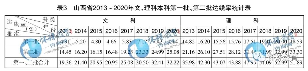 幸运的是,由于2000~2005年正值全国各高校扩招高峰期间,高考报名人数的增速与高校的扩招速度基本上保持同步,高考达线率基本保持稳定。但是,从2006年开始,在招生规模基本保持稳定的前提下,报考人数仍然在继续增加,高考达线率逐年降低,2008年降到低点,从2009年又开始上升。表3列出了山西省2013~2020年文、理科本科第一、二批(不含2C类)达线率统计表。