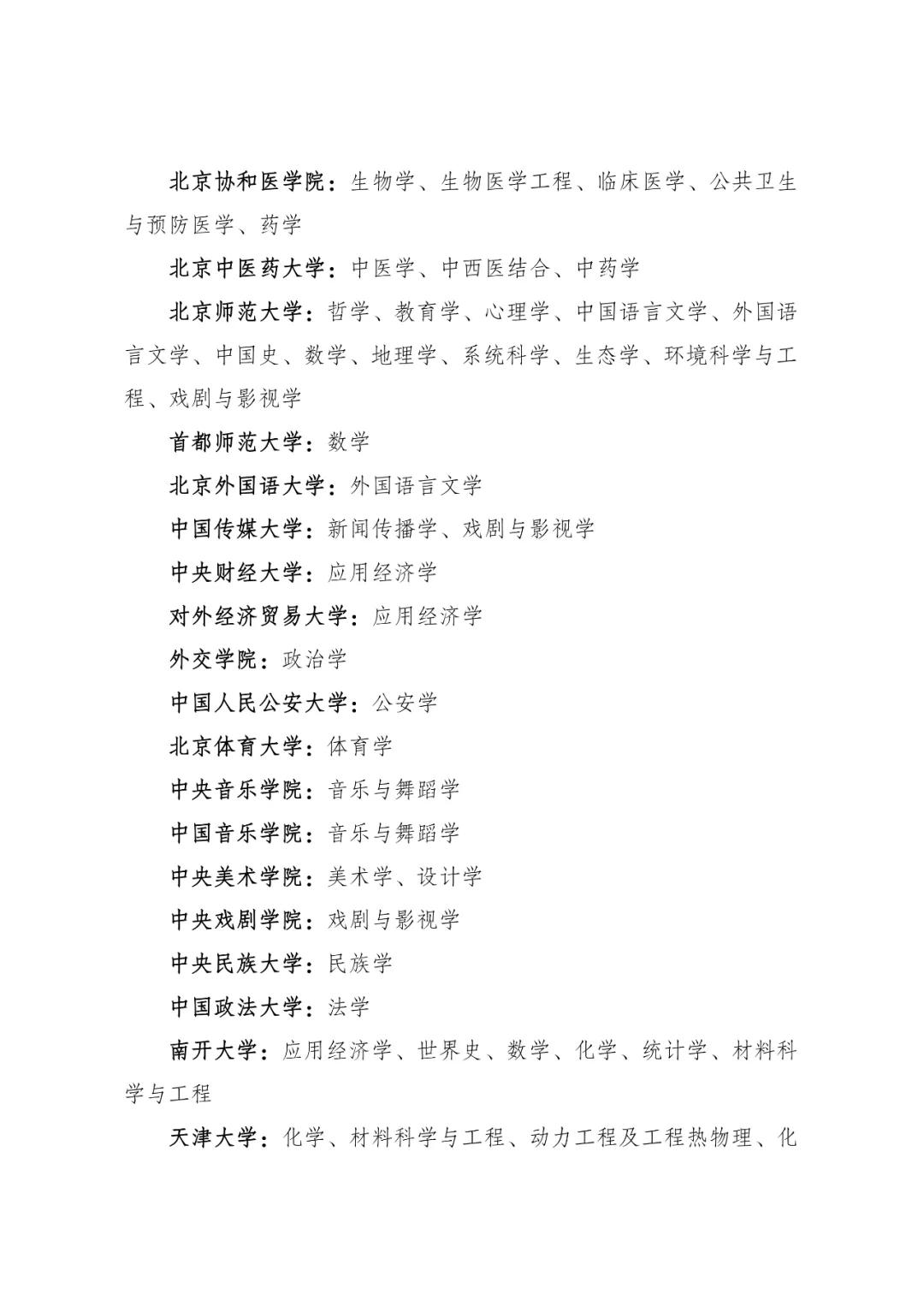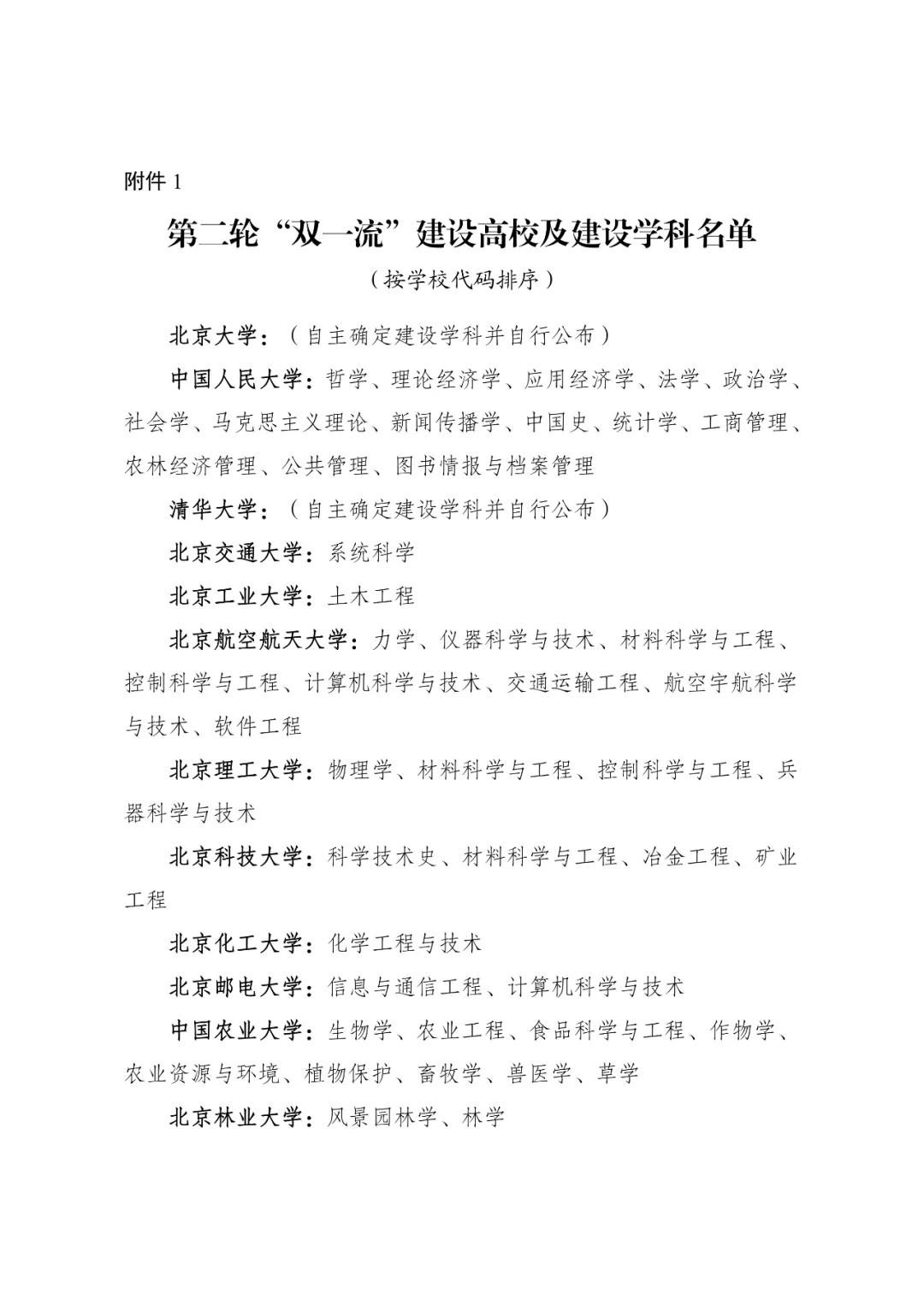 根据国务院《统筹推进世界一流大学和一流学科建设总体方案》,以及教育部、财政部、国家发展改革委《关于深入推进世界一流大学和一流学科建设的若干意见》和《统筹推进世界一流大学和一流学科建设实施办法(暂行)》,经专家委员会认定,教育部等三部委研究并报国务院批准,现公布第二轮“双一流”建设高校及建设学科名单(见附件1)和给予公开警示(含撤销)的首轮建设学科名单(见附件2)。