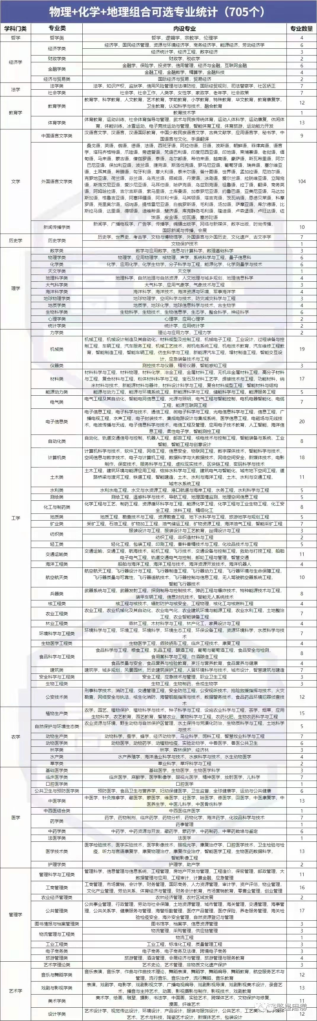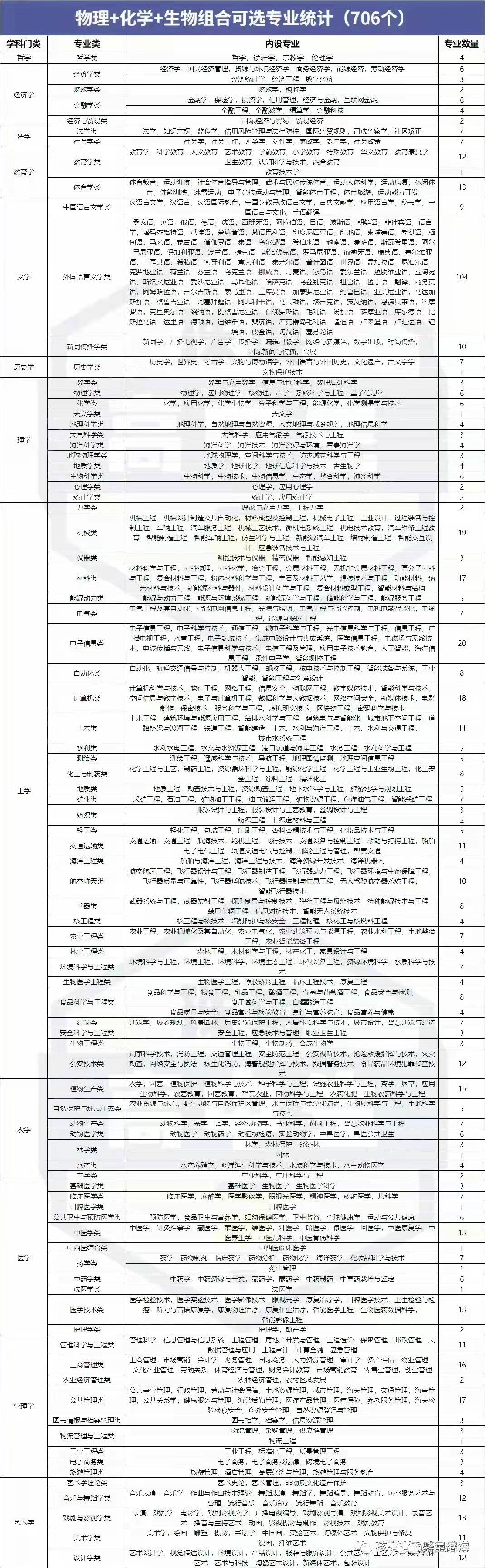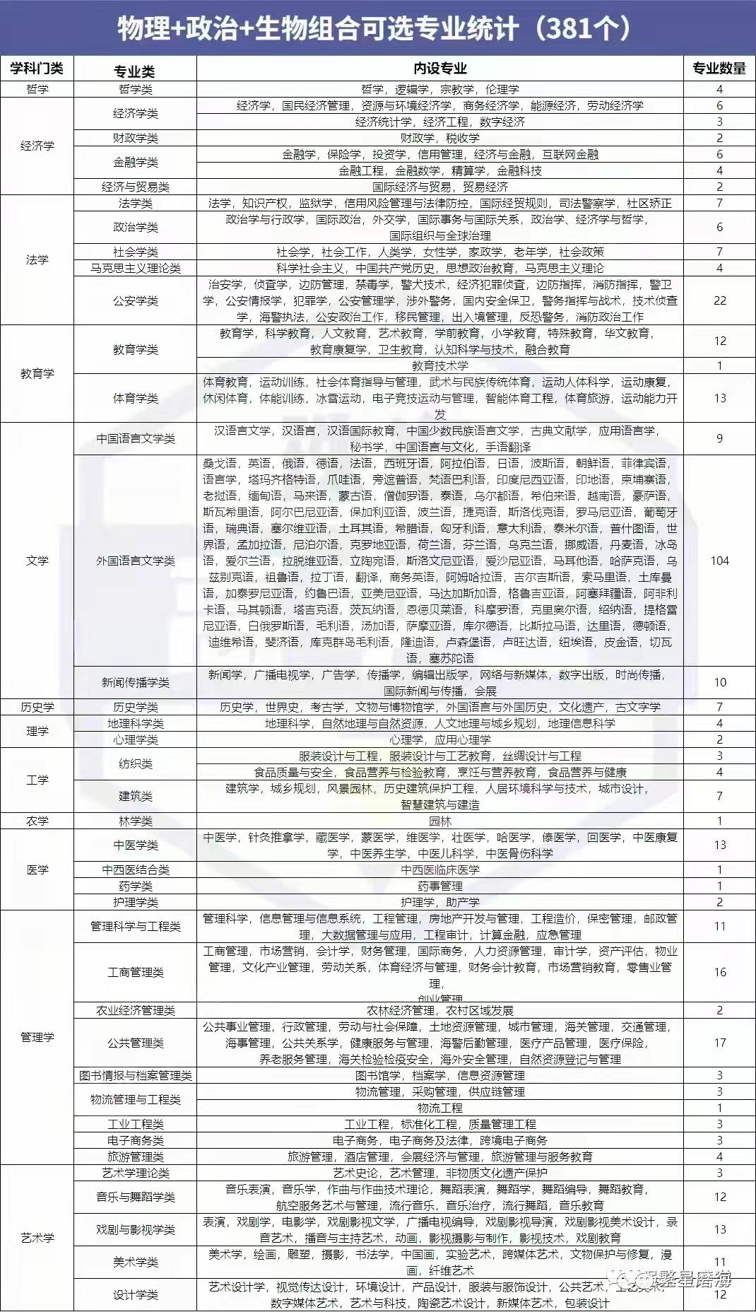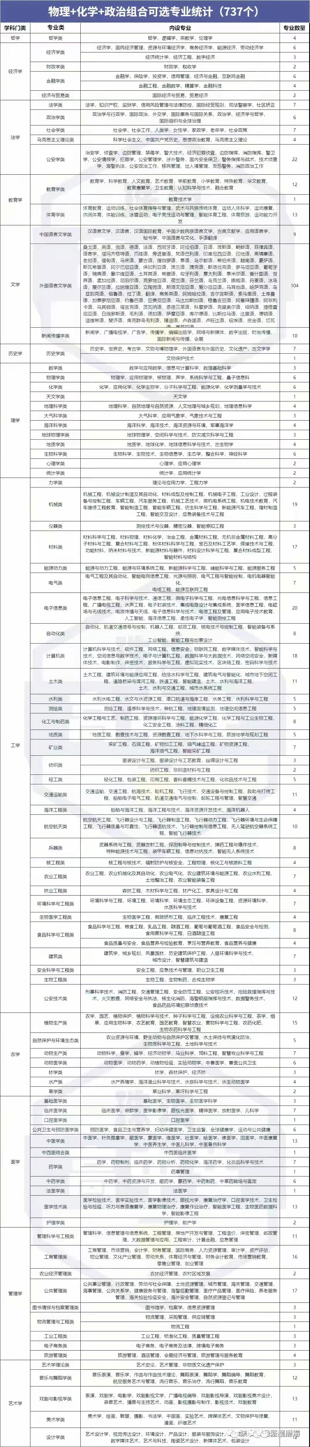 新高考模式“3+1+2”有12种选科组合。物化政是涉及高校专业种类最多的: