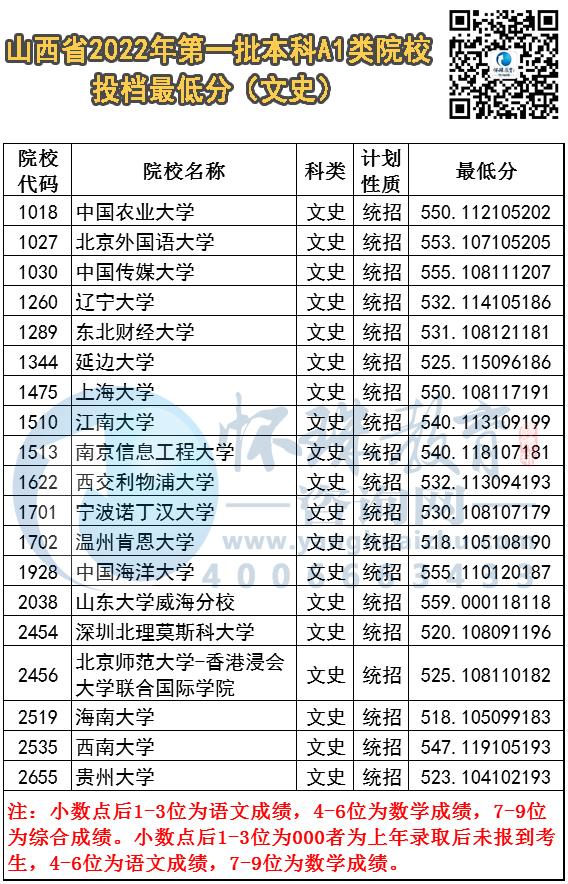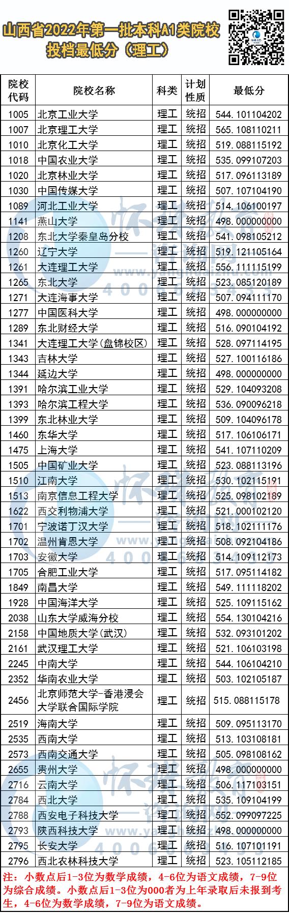 山西省2022年普通高校招生第一批本科A1类院校投档最低分