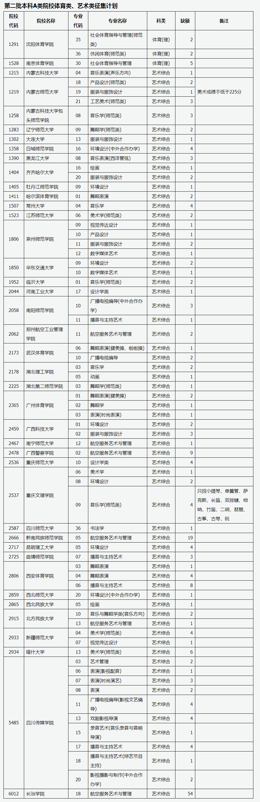 (第二批本科A类体育类、艺术类院校)