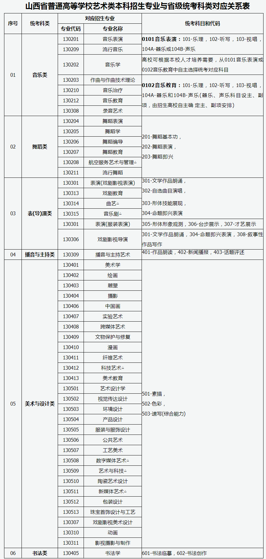 根据《教育部办公厅关于印发<普通高等学校艺术类本科考试招生专业目录(试行)>的通知》 (教学厅〔2022〕7号)和《山西省高等学校招生委员会关于加强和改进普通高等学校艺术类专业考试招生工作的实施方案》(晋招委〔2022〕1号)要求,为进一步改进艺术类专业考试方式,大力推进艺术类专业分类考试,制定了《山西省普通高等学校艺术类本科招生专业与省级统考科类对应关系》,2024年起在普通高等学校艺术类专业考试招生工作中施行。现印发给你们,请遵照执行。