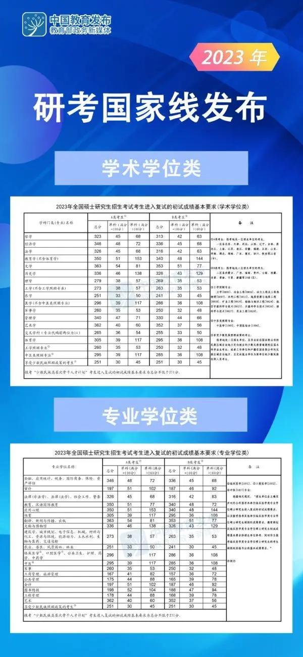 近日,教育部发布《2023年全国硕士研究生招生考试考生进入复试的初试成绩基本要求》(国家分数线)。根据《2023年全国硕士研究生招生工作管理规定》,各招生单位将在国家分数线的基础上,自主确定并公布本单位考生进入复试的初试成绩要求及其他学术要求。