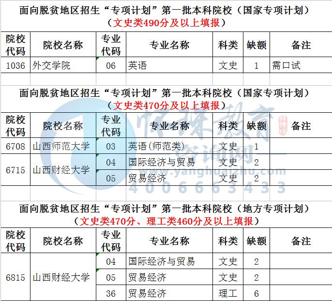 面向脱贫地区招生“专项计划”第一批本科院校限符合条件的考生填报,成绩需达到第一批本科最低控制线:文史类490分(部分院校文史类470分、理工类460分)。