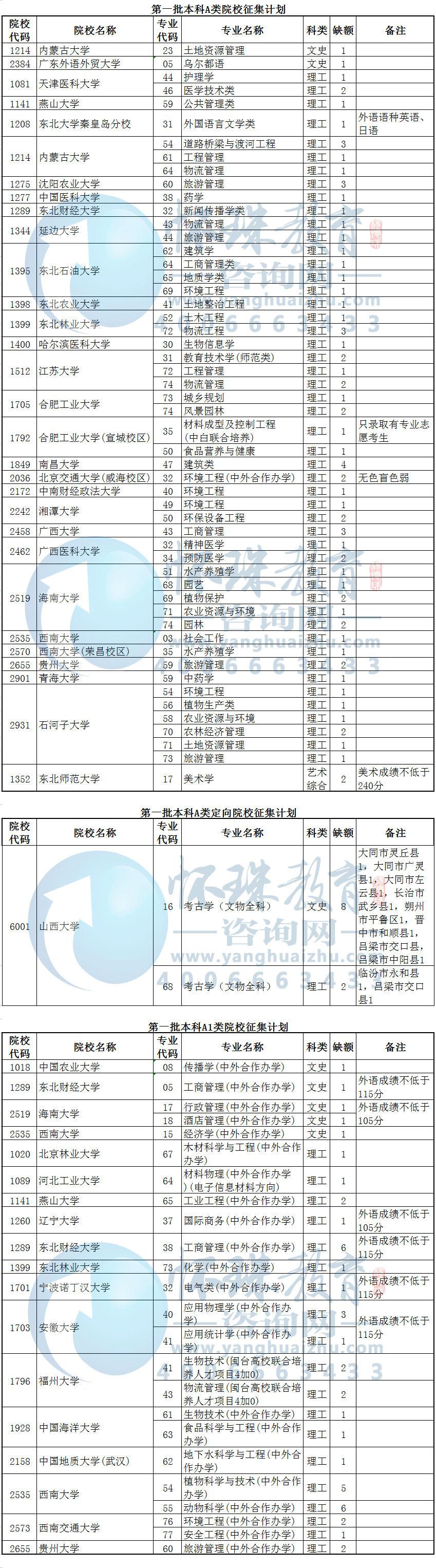目前,我省第一批本科A类、A1类部分院校因生源不足或考生不服从专业调剂退档出现缺额。现予集中公布,公开征集志愿。