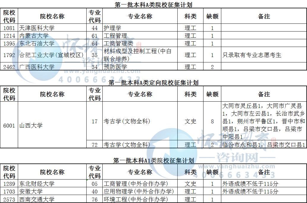 目前,我省第一批本科A类、A1类、B类部分院校因生源不足或考生不服从专业调剂、考生体检专业受限退档出现缺额。现予集中公布,公开征集志愿。