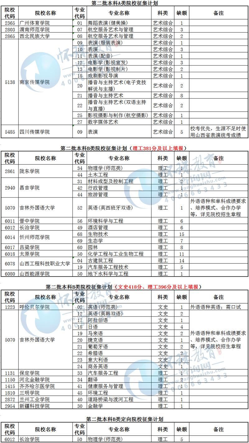 1、凡达到山西省2023年普通高校招生第二批本科录取最低控制分数线的未录取考生均可报考(部分院校:理工类381分)。