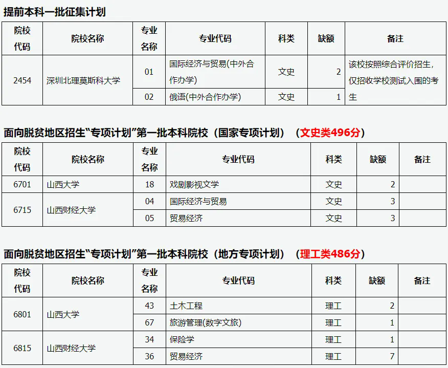 2、面向脱贫地区招生“专项计划”第一批本科院校限符合条件的考生填报,文史类496分、理工类486分。