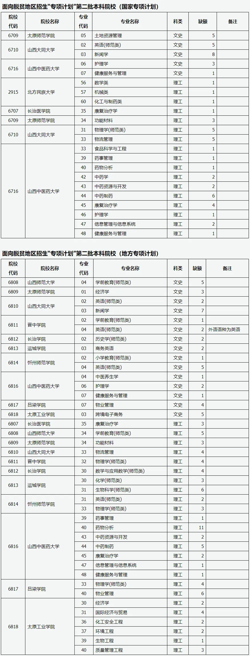 目前,我省面向脱贫地区招生“专项计划”第二批本科院校因生源不足或考生不服从专业调剂退档出现缺额。现予集中公布,公开征集志愿。