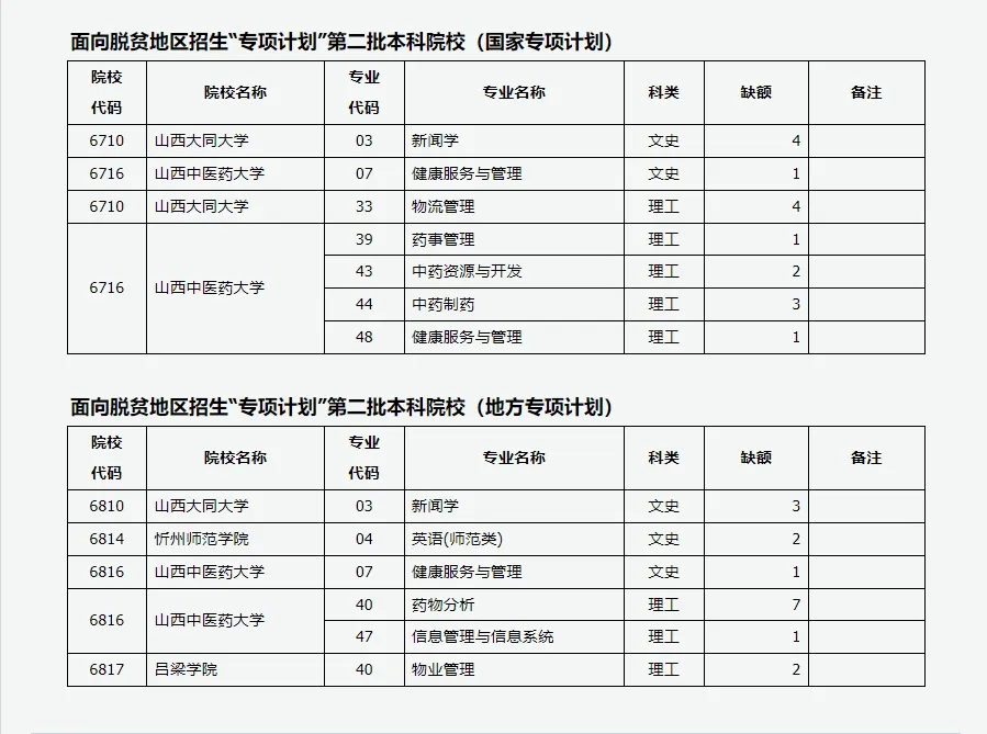 ?xml:namespace>目前,我省面向脱贫地区招生“专项计划”第二批本科院校因生源不足或考生不服从专业调剂退档出现缺额。现予集中公布,公开征集志愿。