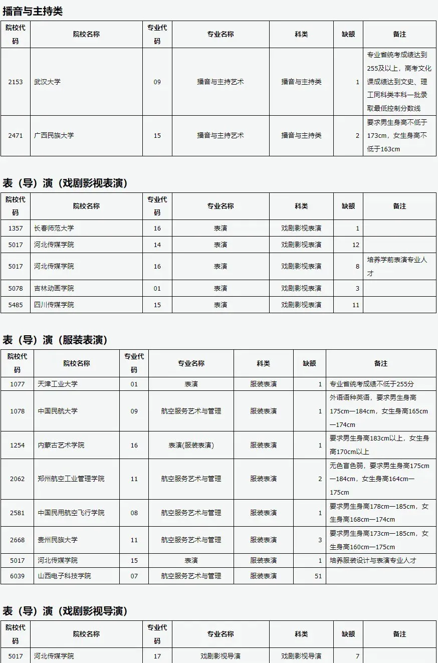 目前,我省艺术本科批院校因生源不足或考生不服从专业调剂退档出现缺额。现予集中公布,公开征集志愿。
