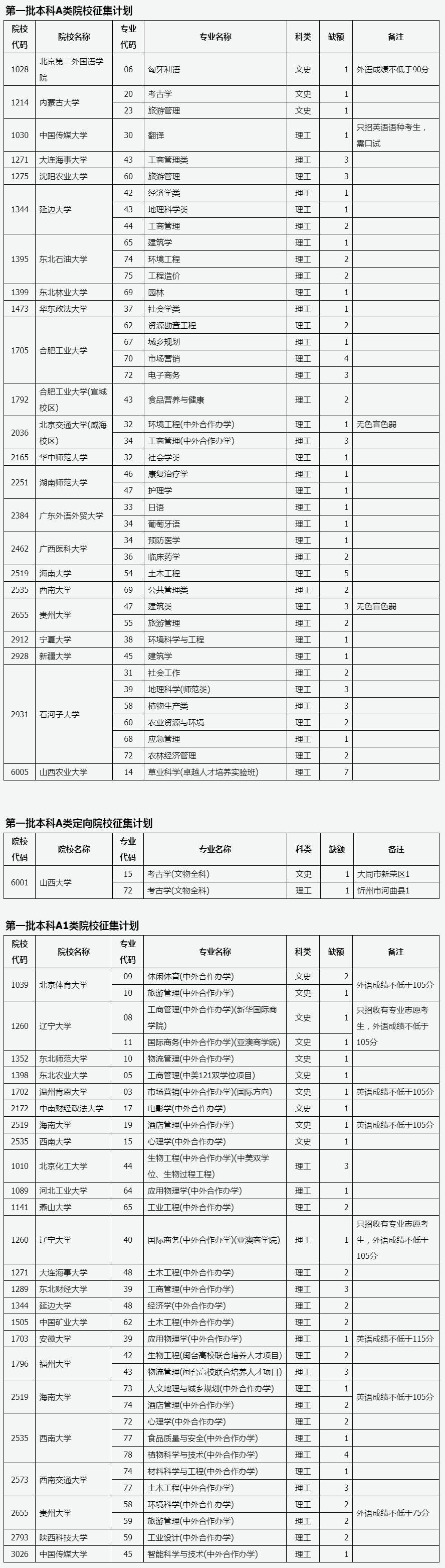 目前,我省第一批本科A类、A1类部分院校因生源不足或考生不服从专业调剂退档出现缺额。现予集中公布,公开征集志愿。