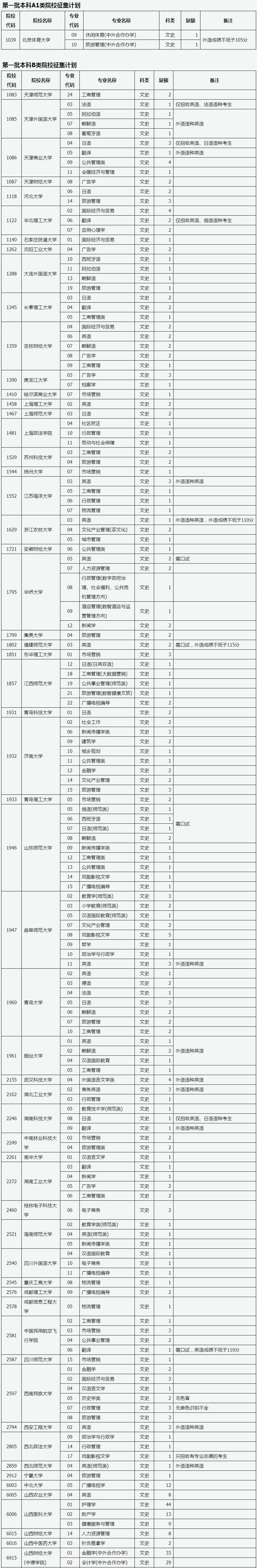 目前,我省第一批本科A1类、B类部分院校因生源不足或考生不服从专业调剂退档出现缺额。现予集中公布,公开征集志愿。