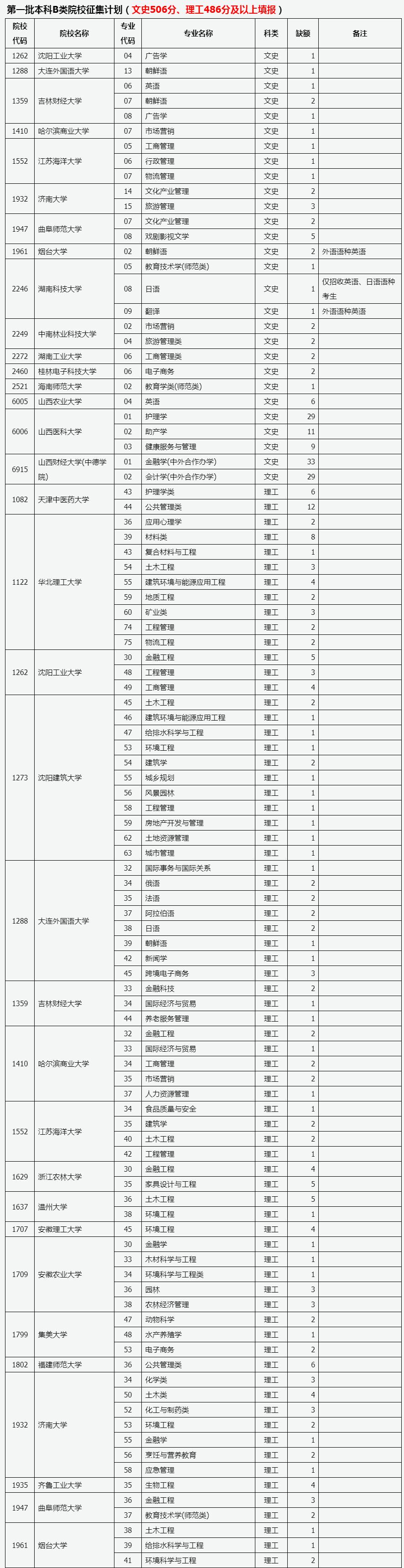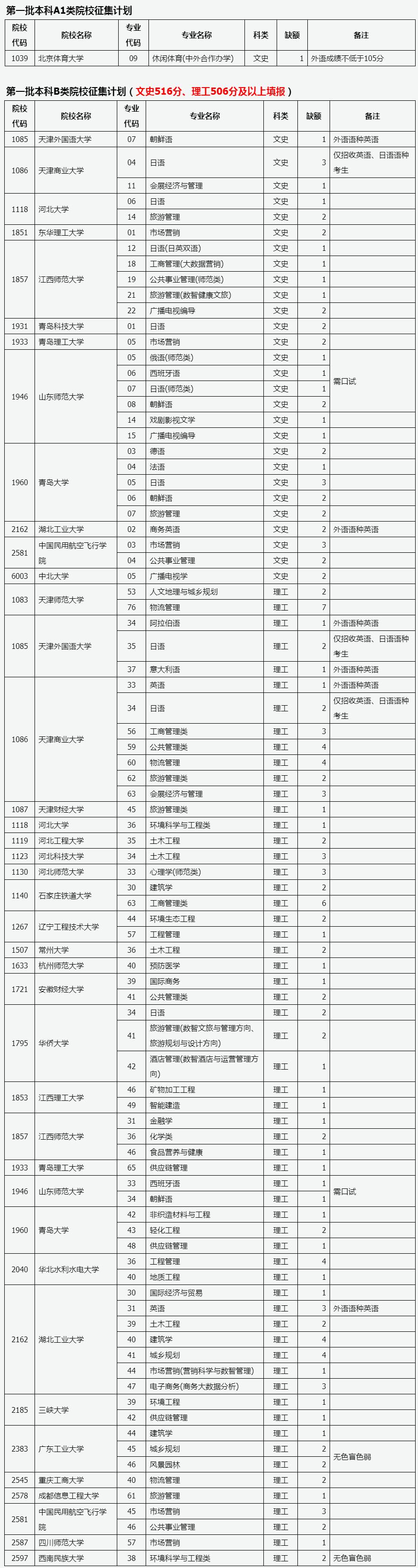 目前,我省第一批本科A1类、B类部分院校因生源不足或考生不服从专业调剂退档出现缺额。现予集中公布,公开征集志愿。