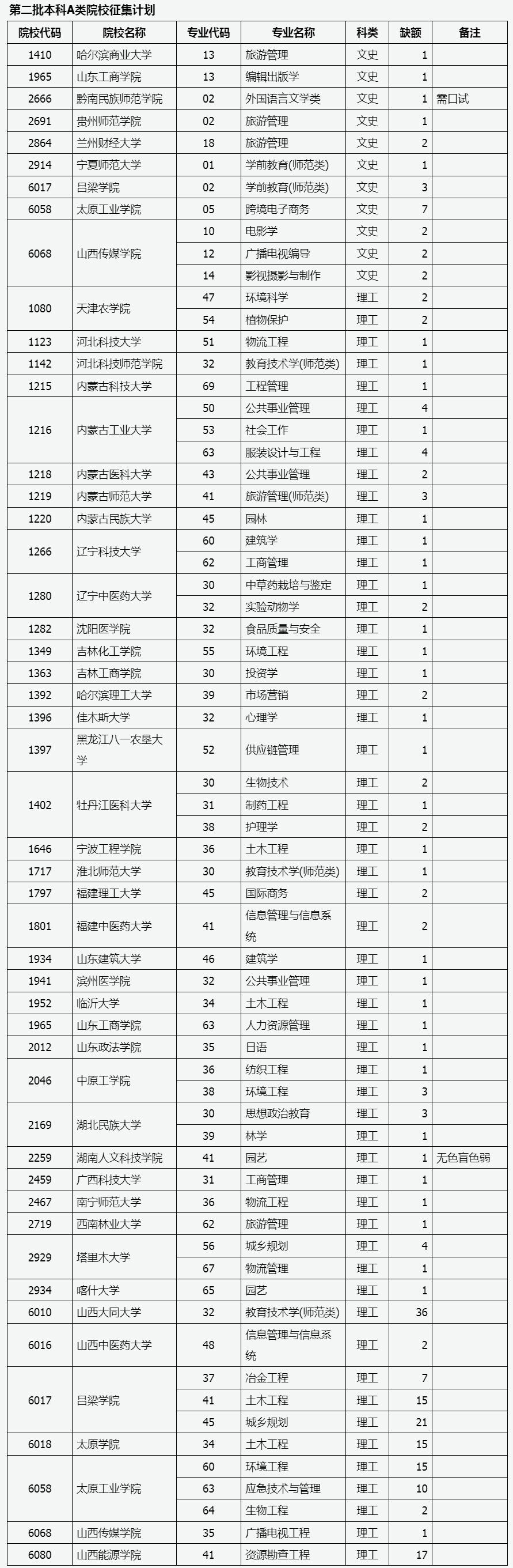?xml:namespace>目前,我省第二批本科A类部分院校因生源不足或考生不服从专业调剂退档出现缺额。现予集中公布,公开征集志愿。