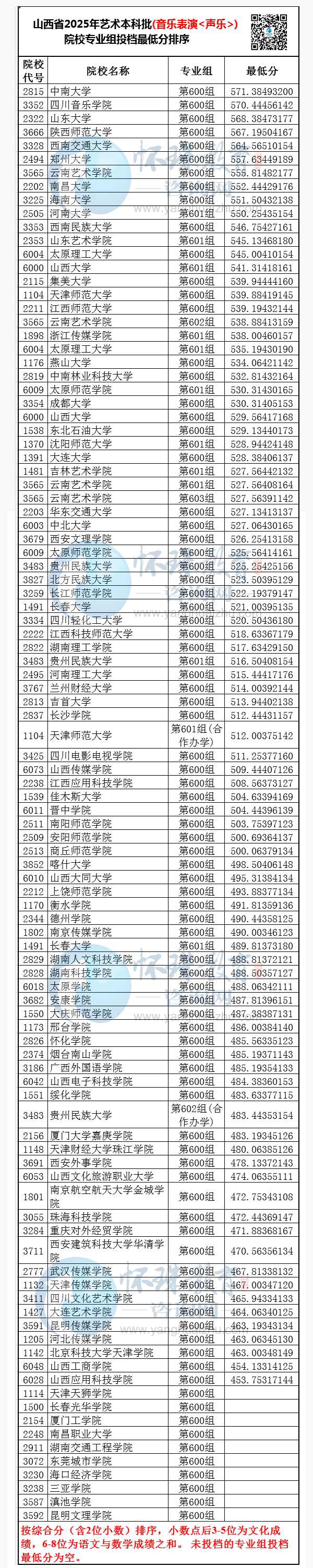 山西省2025年艺术本科批(音乐表演<声乐>)院校专业组投档最低分